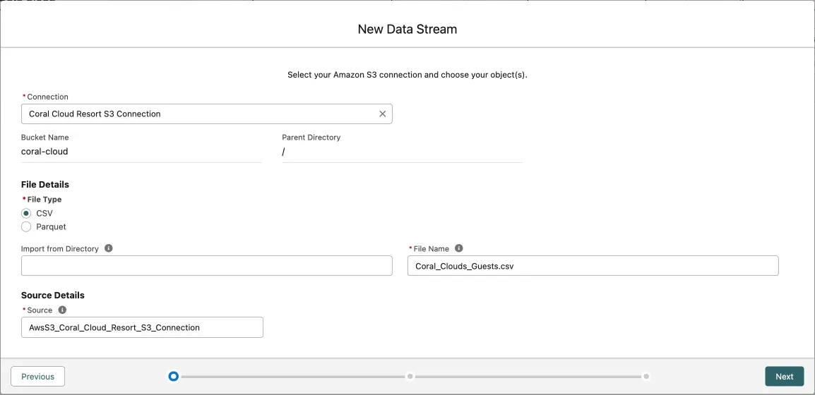 Field Value Connection Coral Cloud Resorts S3 ConnectionFile Type CSVImport from Directory Leave blank File Name Coral_Clouds_Guests.csvSource Keep default: AwsS3_Coral_Cloud_S3_Connection
