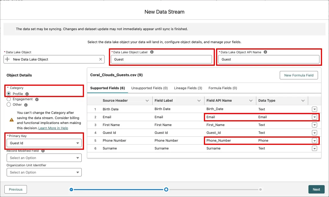 Field Value Data Lake Object Label GuestData Lake Object API Name Keep default Category ProfilePrimary Key Guest IdEmail Data Type EmailPhone Number Data Type PhoneUse the screenshot below to make sure you set all the right values.