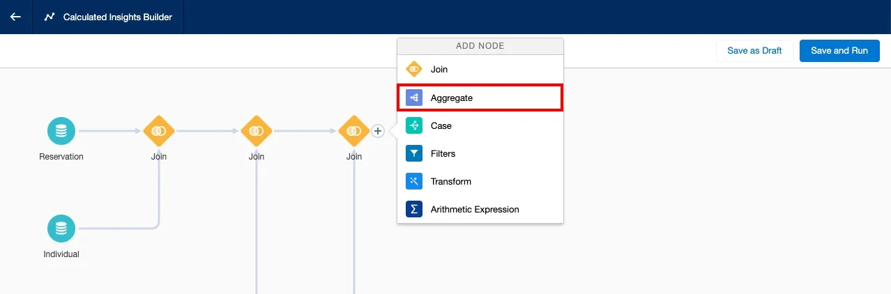Click the Plus (+) icon next to the last join on the right, and click Aggregate.