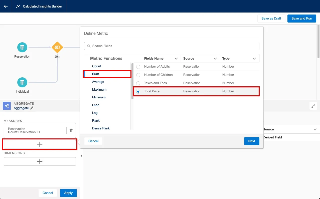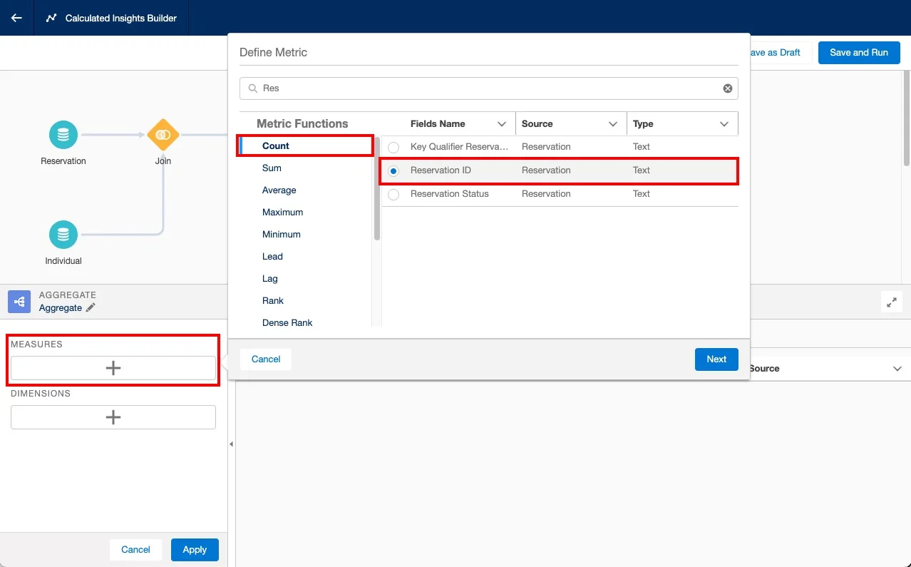 With the objects and joins in place, you can now define the measures that you want to calculate. In this step, you will calculate the total number of reservations made by a customer (Lifetime Reservations).