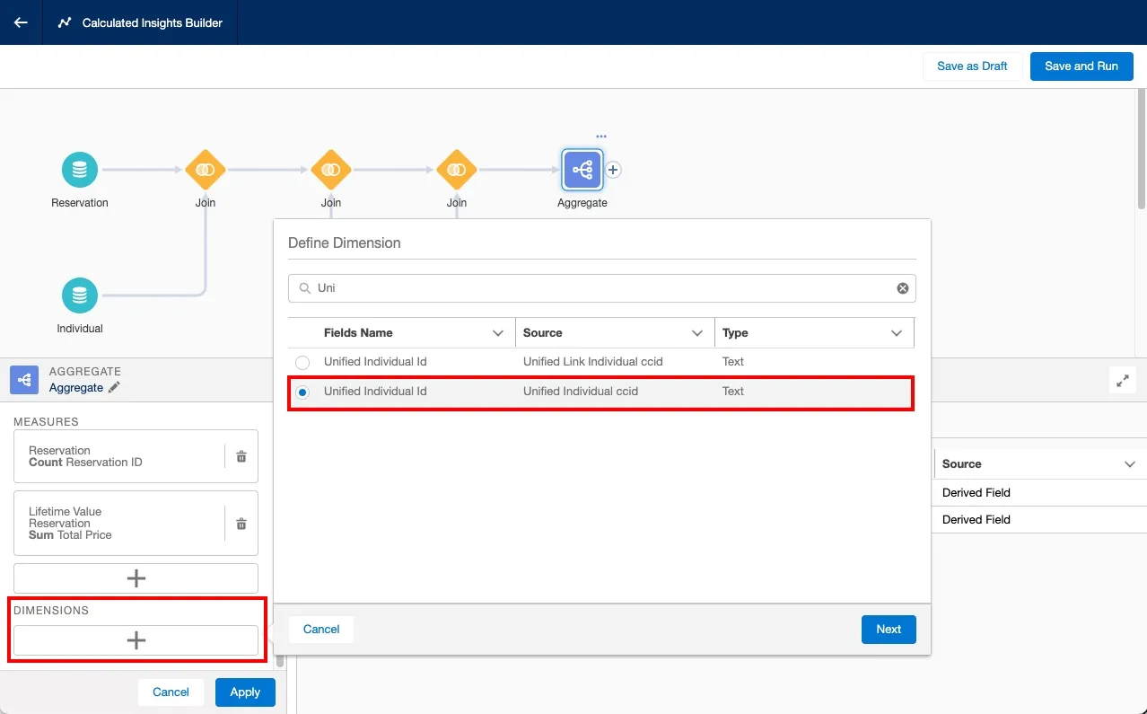 Finally, you'll create a dimension that tells Data Cloud to group the data by unified individual.