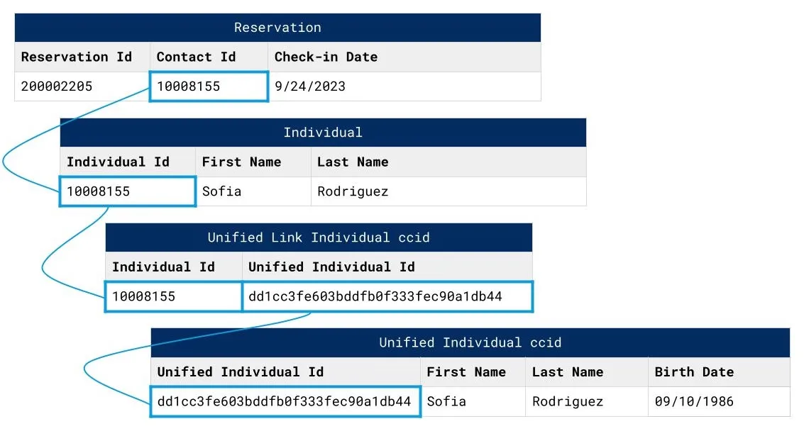 Here is another diagram illustrating how tables are joined to connect a reservation to a unified individual: