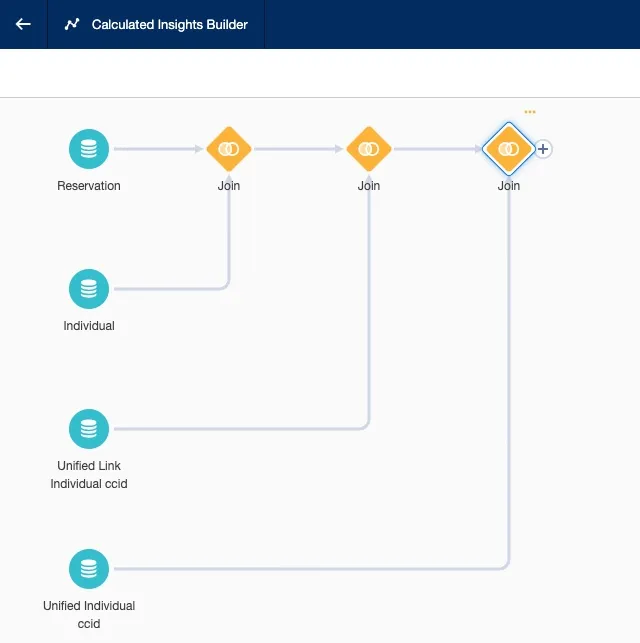 Examine the joins that Data Cloud automatically created to link a reservation to a unified profile in the Unified Individual ccid object.