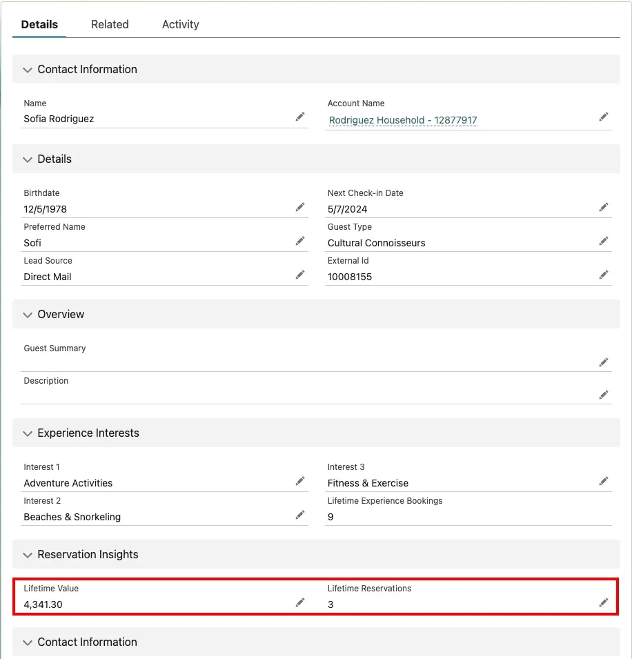 On the Details tab, scroll down to view the new values for Lifetime Value and Lifetime Reservations.