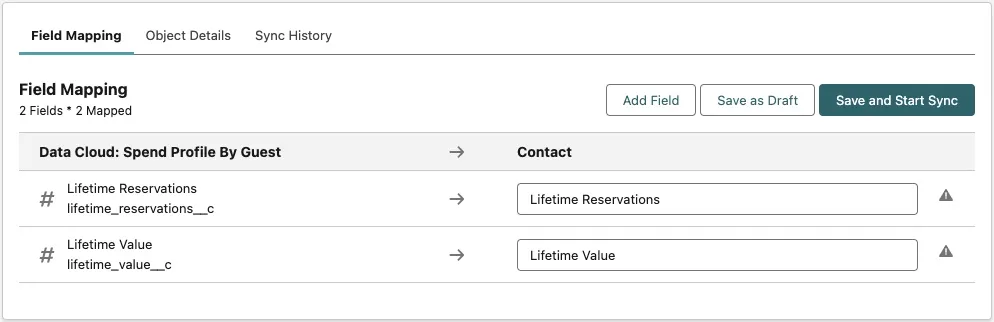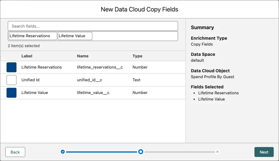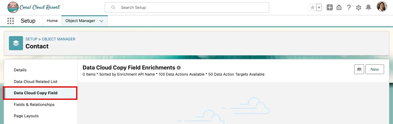 In this exercise, you'll use CRM Enrichment to copy values from Data Cloud to Salesforce. You'll copy the calculated insights you created in the previous exercise (Lifetime Reservations and the Lifetime Customer Value) to fields in the Contact object.