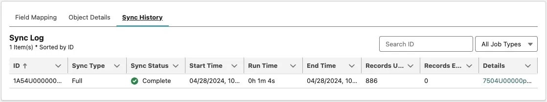 After a few minutes, click the Sync History tab in the Spend Profile By Guest Data Cloud Copy Field enrichment. Verify the Sync Status is Complete. If not, wait until it completes.