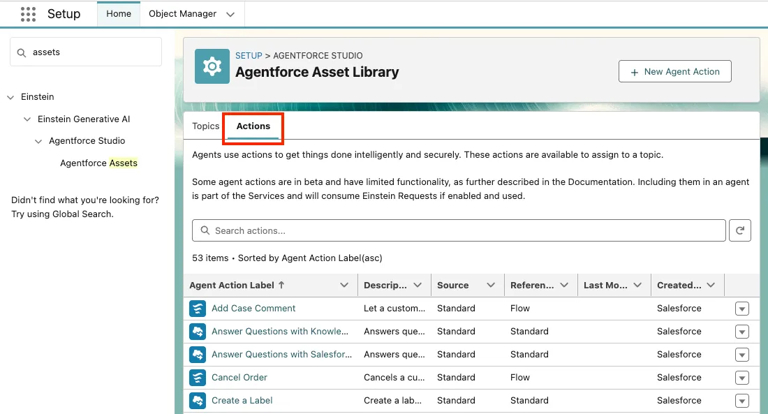 From Setup, open Agentforce Assets and select the Actions Tab.