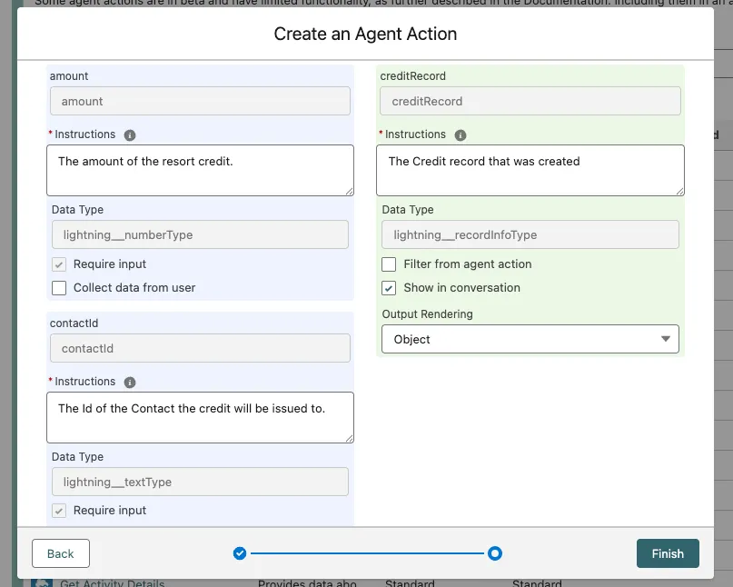 Field Value Reference Action Type Flow Reference Action Issue Resort Credit Agent Action Label Keep default Agent Action API Name Keep default
