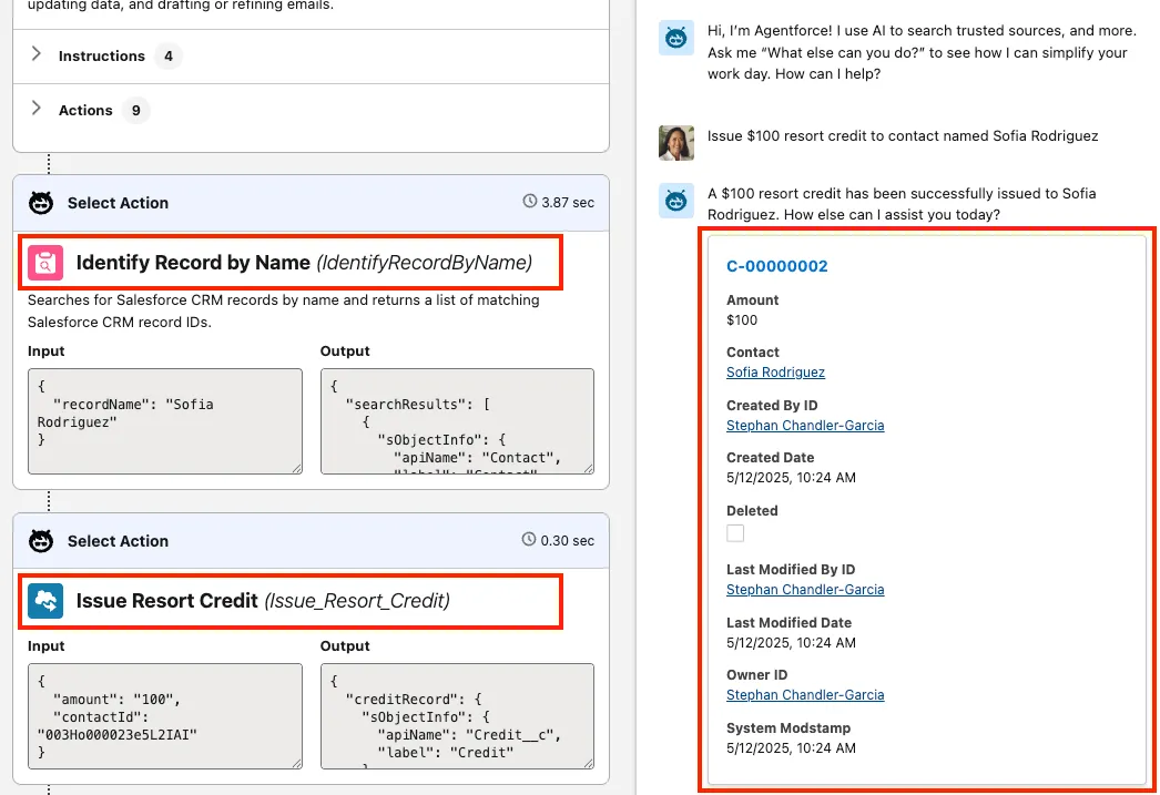 txtIssue $100 resort credit to contact named Sofia RodriguezIn the planner, notice that the reasoning engine first selected the Identify Record By Name action, then the Issue Resort Credit action you just created.