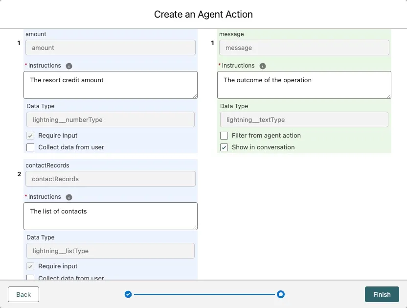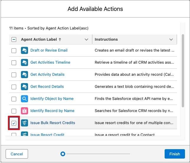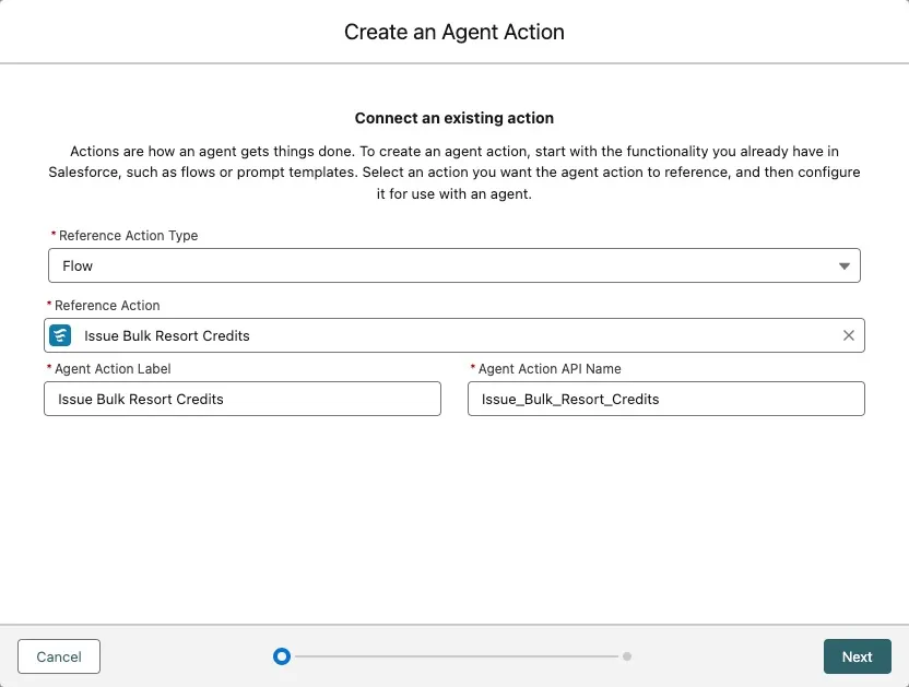 Field Value Reference Action Type Flow Reference Action Issue Bulk Resort Credits Agent Action Label Keep default Agent Action API Name Keep default