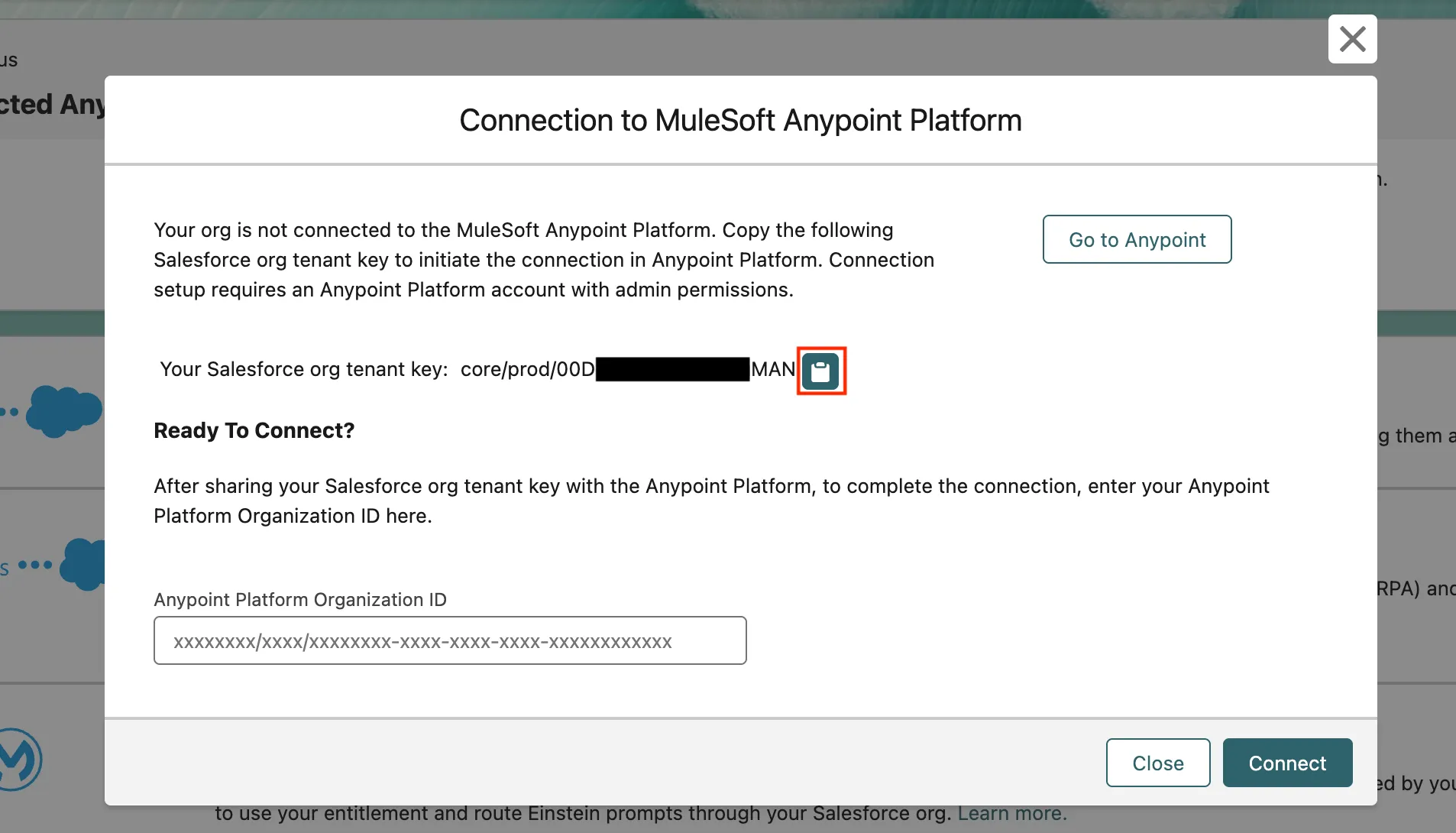 Coral Cloud CRMfor your connection and click Add.Copy the Anypoint Platform Org Key and click Close.