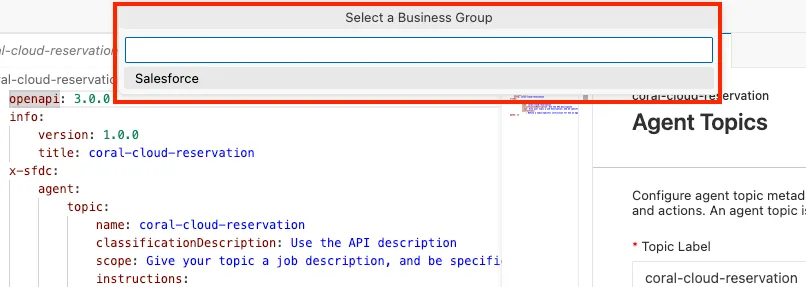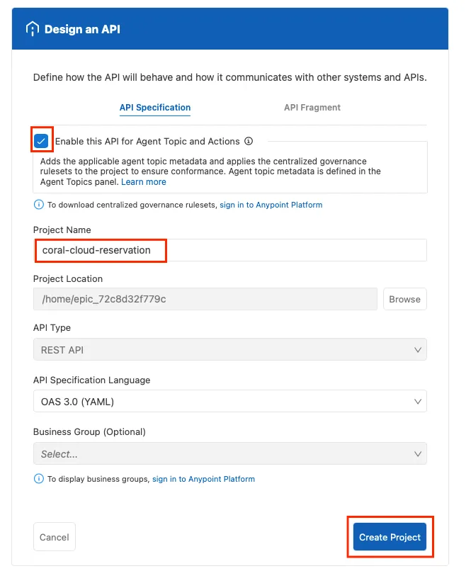 Field Value Enable this API for Agent Topic and Actions TrueProject Name coral-cloud-reservationProject Location default API Type default API Specification OAS 2.0 (YAML)Business Group Leave blank Click Create Project.