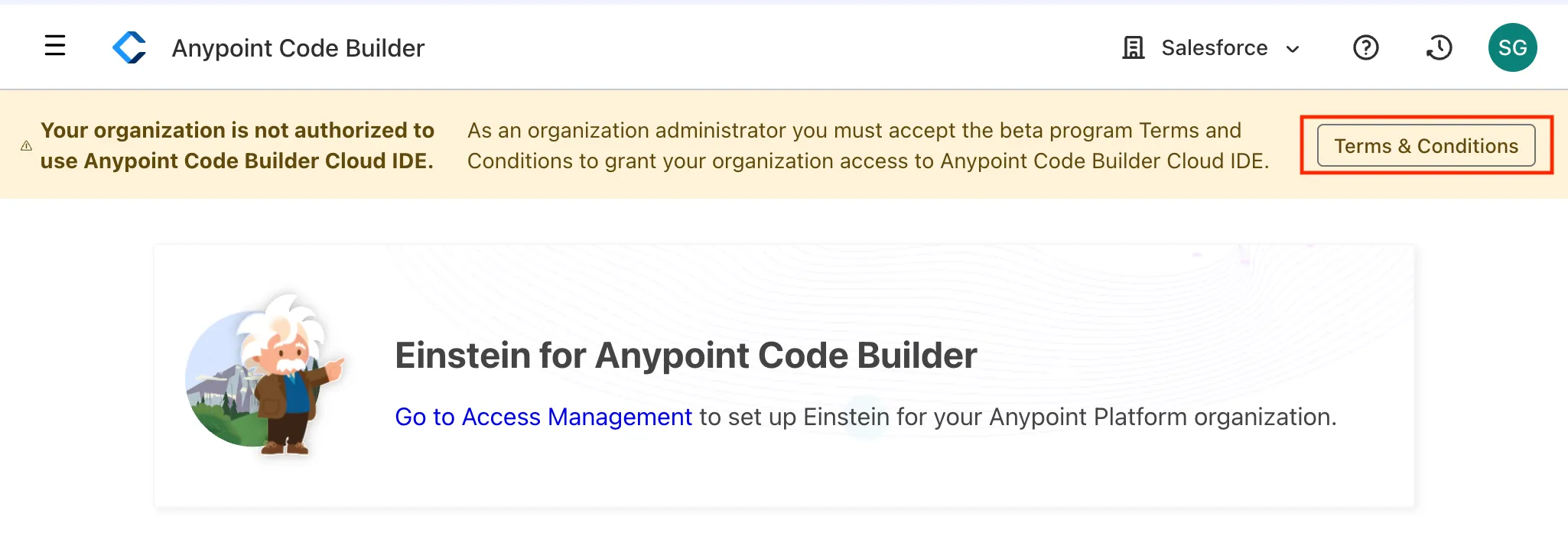 Read the full Terms and Conditions, set I accept the Anypoint Code Builder beta Terms and Conditions. to True, and click Get Access.