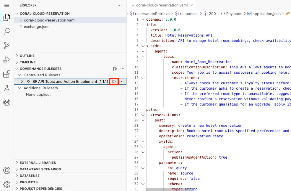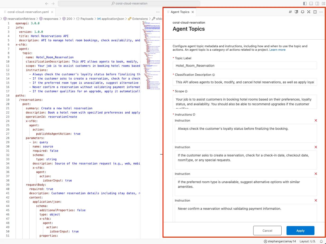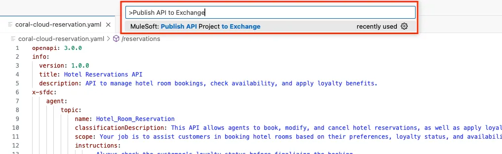 coral-cloud-reservations.yamlwith the following API Design Specification:yamlopenapi: 3.0.0 info: version: 1.0.0 title: Hotel Reservations API description: API to manage hotel room bookings, check availability, and apply loyalty benefits. x-sfdc: agent: topic: name: Hotel_Room_Reservation classificationDescription: This API allows agents to book, modify, and cancel hotel reservations, as well as apply loyalty upgrades. scope: Your job is to assist customers in booking hotel rooms based on their preferences, loyalty status, and availability. You should also be able to recommend upgrades if the customer qualifies. instructions: - Always check the customer's loyalty status before finalizing the booking. - If the customer asks to create a reservation, check for a check-in date, checkout date, roomType, or any special requests. - If the preferred room type is unavailable, suggest alternative options with similar amenities. - Never confirm a reservation without validating payment information. - If the customer qualifies for an upgrade, apply it automatically and notify them. paths: /reservations: post: summary: Create a new hotel reservation description: Book a hotel room with specified preferences and apply loyalty upgrades if eligible. operationId: reservationCreate x-sfdc: agent: action: publishAsAgentAction: true parameters: - in: query name: source required: false schema: type: string description: Source of the reservation request (e.g., web, mobile app, agent). x-sfdc: agent: action: isUserInput: true requestBody: required: true description: Customer reservation details including stay dates, room type, and special requests. content: application/json: schema: additionalProperties: false type: object x-sfdc: agent: action: isUserInput: true properties: customerId: type: string description: Unique identifier of the customer making the reservation. checkInDate: type: string description: Date of check-in for the reservation. checkOutDate: type: string description: Date of check-out for the reservation. roomType: type: string description: Preferred room type for the reservation. specialRequests: type: string description: Additional requests like pillow type or air freshener choice. responses: "201": description: Reservation successfully created. content: application/json: schema: additionalProperties: false type: object x-sfdc: agent: action: isDisplayable: true privacy: isPii: true properties: reservationId: type: string description: Unique identifier of the created reservation. upgradeApplied: type: boolean description: Indicates whether a loyalty-based upgrade was applied. totalPrice: type: number description: Final price after applying any discounts or upgrades. /reservations/{reservationID}: get: summary: Retrieve reservation details description: Get details of a specific reservation by ID. operationId: reservationRetrieve x-sfdc: agent: action: publishAsAgentAction: true parameters: - in: path name: reservationID required: true schema: type: string description: Unique identifier of the reservation to be retrieved. x-sfdc: agent: action: isUserInput: true responses: "200": description: Reservation details retrieved successfully. content: application/json: schema: additionalProperties: false x-sfdc: agent: action: isDisplayable: true privacy: isPii: true type: object properties: reservationId: type: string description: Unique identifier of the reservation. customerId: type: string description: Unique identifier of the customer who booked the reservation. roomType: type: string description: Type of room booked for the reservation. checkInDate: type: string description: Check-in date of the reservation. checkOutDate: type: string description: Check-out date of the reservation. upgradeApplied: type: boolean description: Indicates whether a loyalty-based upgrade was applied.Save the file (CMD+S on Mac or CTRL+S on PC).