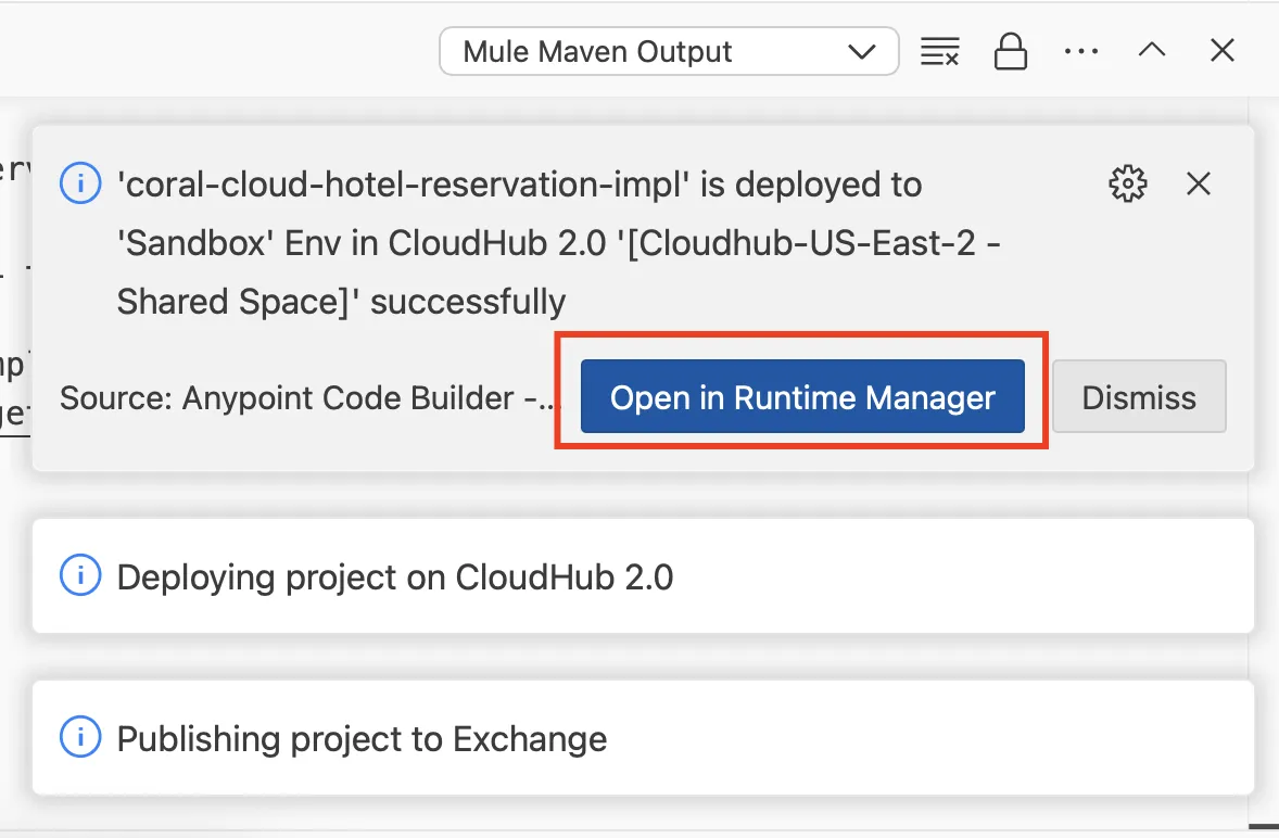 coral-cloud-reservation.xmlopen, click the Rocket icon. - Select CloudHub 2.0.