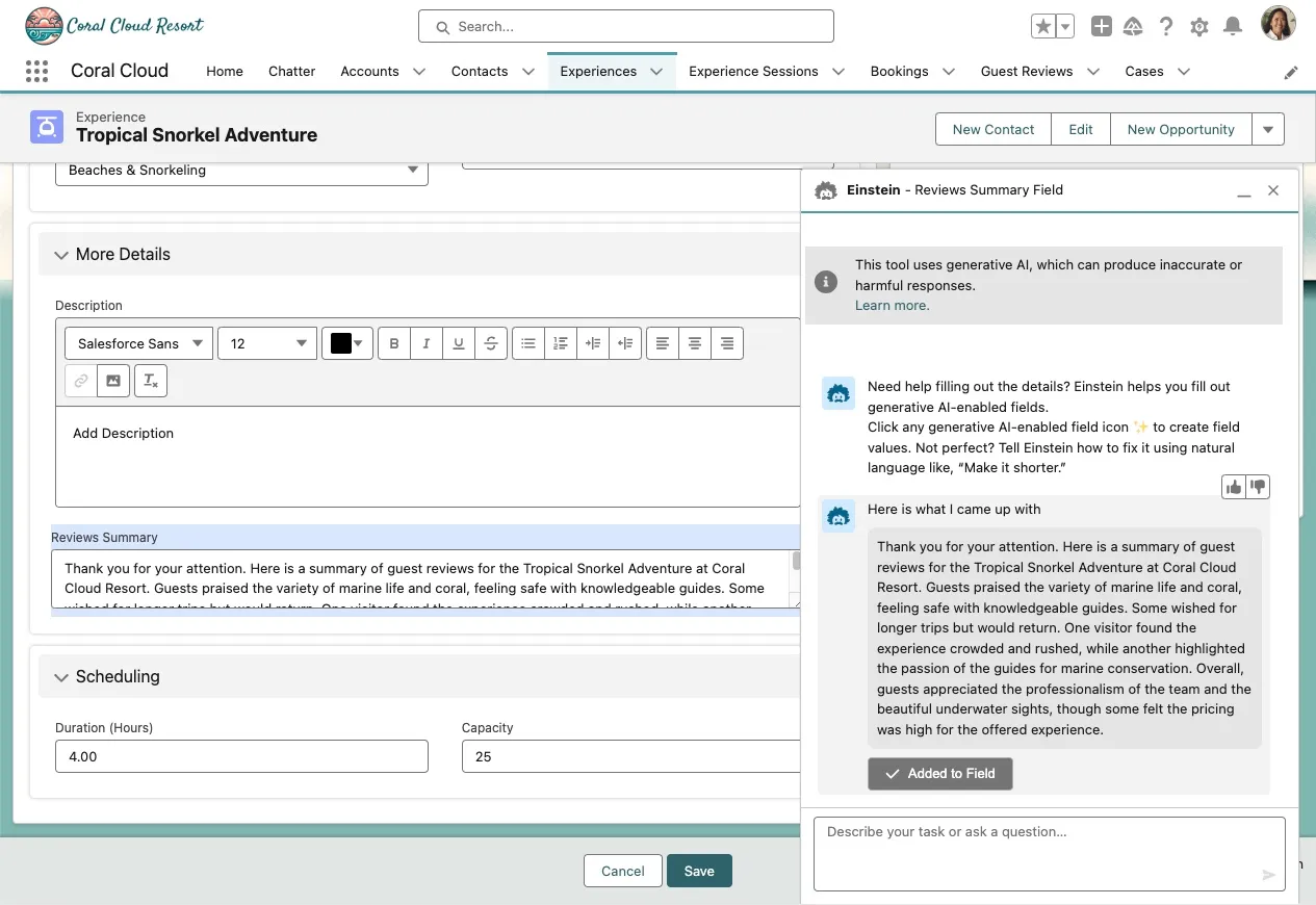 In this exercise, you'll use a Field Generation template to automatically generate a summary of guest reviews for resort experiences. You'll ground the template with related list merge fields.
