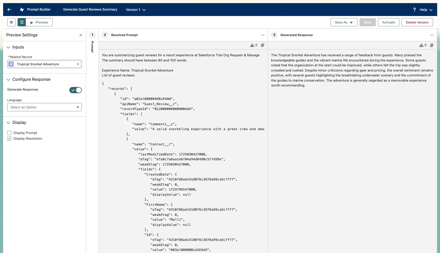 In the Resolved Prompt panel (bottom left), examine the prompt that was generated. Notice that the related list merge field has been replaced by the list of guest reviews.