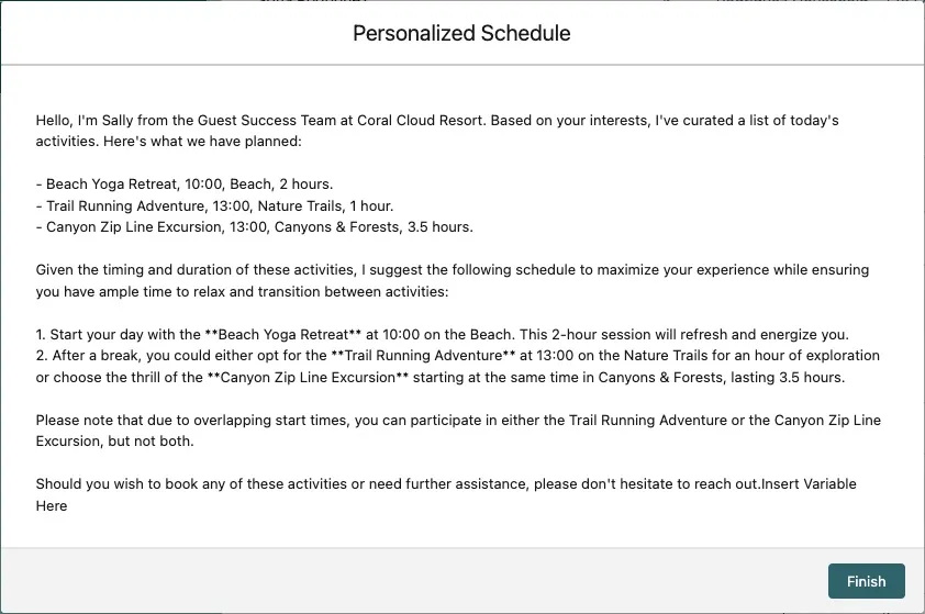 txtYour name is {!$User.FirstName}. You work in the guest success team at {!$Organization.Name}. Introduce yourself, then present the list of resort activities happening today that match the guest's interests. For clarity, use a bullet list. For each activity, include name, time, location and duration on a single line. Do not include the date. Tell the guest to reach out if they'd like to book any of these activities. List of activities happening today that match the guest's interests:In the Preview panel, select Sofia Rodriguez as the Contact.