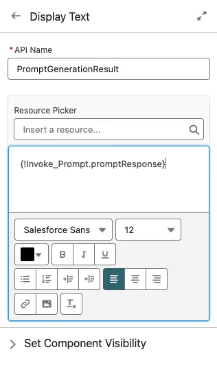 In the Resource Picker in the right panel, select Outputs from Invoke_Prompt > promptResponse (make sure that you delete "Insert Variable Here" if it appears in the rich edit area).