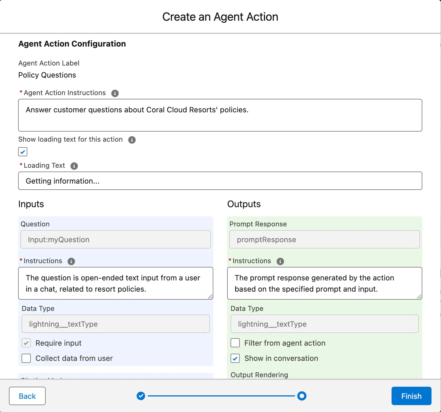 Field Value Reference Action Type Prompt Template Reference Action Policy Questions Agent Action Label Keep default Agent Action API Name Keep default Use the screenshot below to make sure that you entered the values correctly.