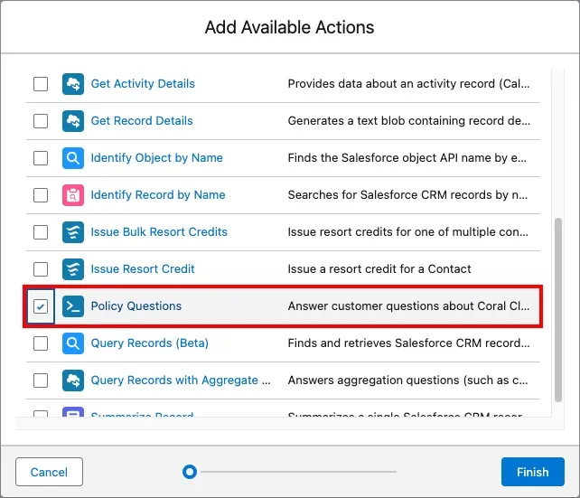 txtAlways use the Policy Questions action when a question is asked about hotel policies, experiences policies, wedding policies, or valet service policies.Click Save.