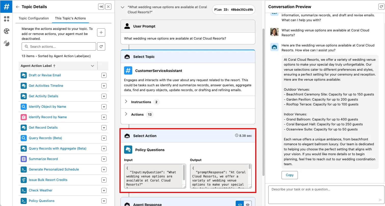 txtWhat wedding venue options are available at Coral Cloud Resorts?Examine the response generated by the LLM. Look at the planner in the middle of the screen and notice that the reasoning engine selected the Policy Questions action.