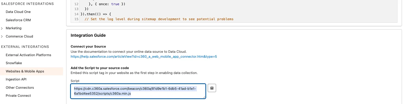 Copy the CDN script url from the Integration Guide section of the website connector.